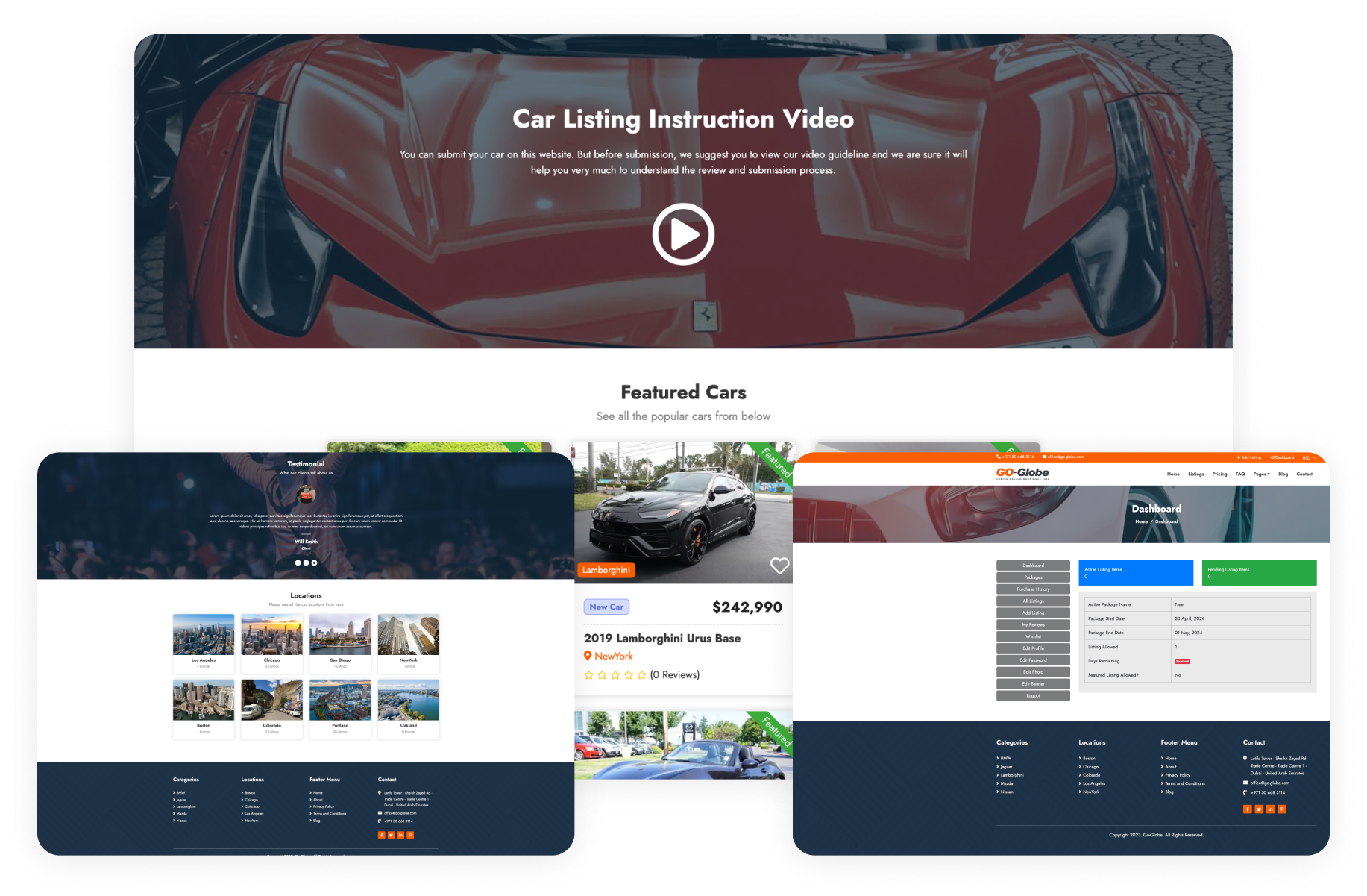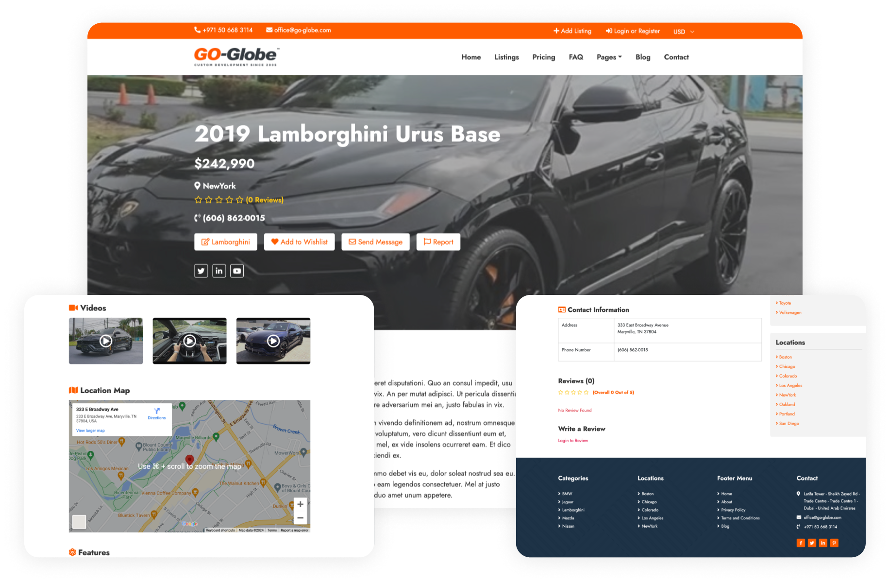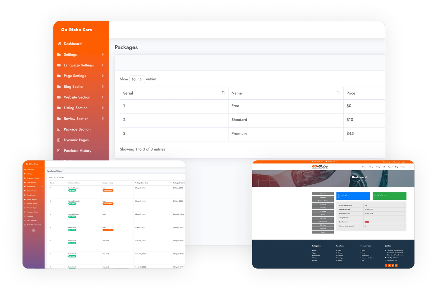 The car listing portal provides comprehensive functionalities for users and administrators. The front end comprises multiple sections such as Home, Currency, About, Pricing, Blog, Post Detail, Comment, Category Detail, Search, FAQ, Dynamic Page, Contact, Store Contact Form, Terms and Conditions, Privacy Policy, Listing Detail, Send Message, and Report Listing, all necessary for supervising a car management software.