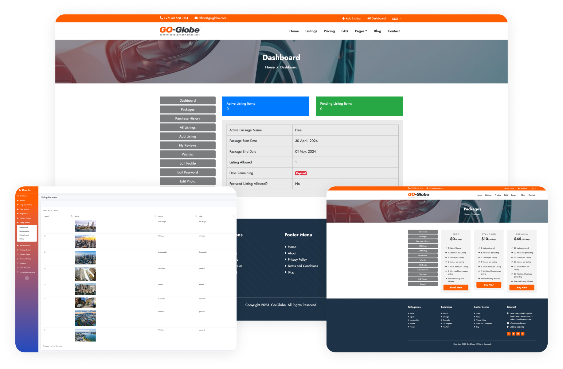 The customer profile features a Dashboard, Package options, Free Enrollment, Buy Package, Payment, Purchase History, Update Profile, View Listing, My Reviews, and wishlist.
