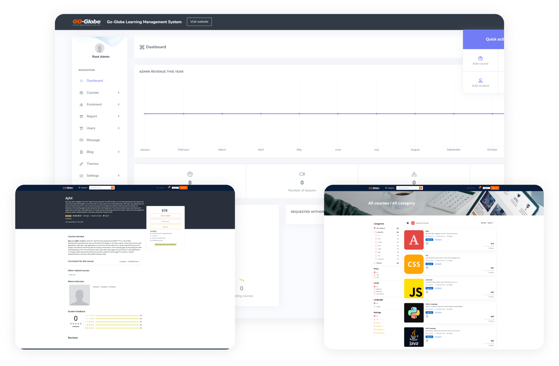 • Course Management: Add, approve, and update course content, including lessons, sections, and quizzes.