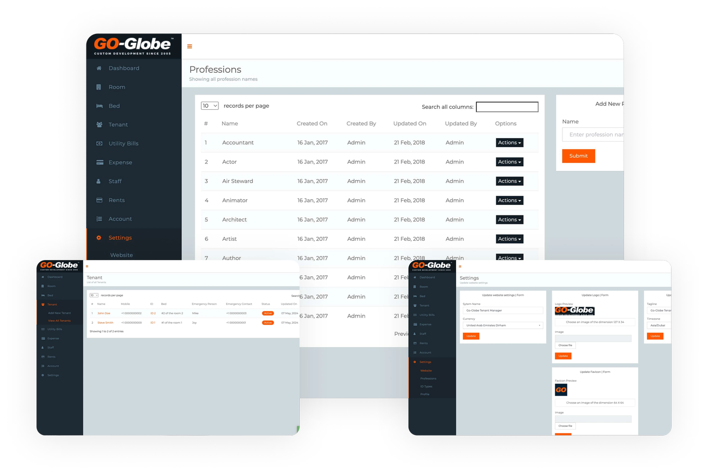 Our Tenant Management System manages tenants with modules for user management (staff & tenants), listings (rooms & beds), finances (expenses, utility bills, rent), staff & tenant details, currencies, ID types, and website settings. Admins can addview, and manage all aspects through a user-friendly interface.